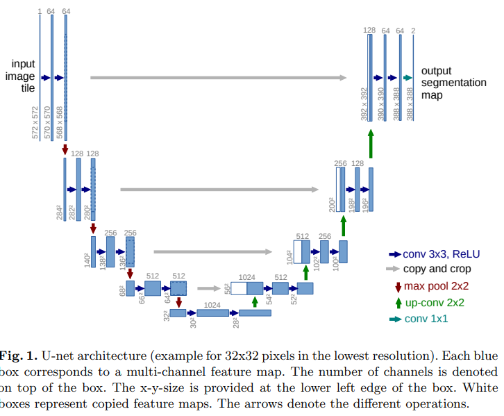- Expanding Path(올라가는부분)에서 Upsampling 할 때, 좀 더 정확한 Localization을 하기 위해서 Contracting Path(내려가는부분)의 Feature map를 Copy and Crop하여 Concat 하는 구조.