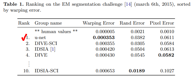보통 Segmentation task는 IOU(Intersection over Union)기법을 통해 성능을 측정한다. 쉽게 말해 라벨영역과 예측영역이 얼마나 겹쳐있는지 계산하는 기법으로 알고있다. UNet 은 여러 Challenge에서 가장 좋은 성능을 보였다. 아래 참고.