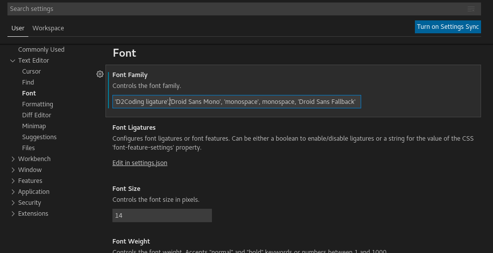 VS code 열고, ctrl+, (콤마) , 'D2Coding ligature' 혹은 'D2Coding' 추가해준다.