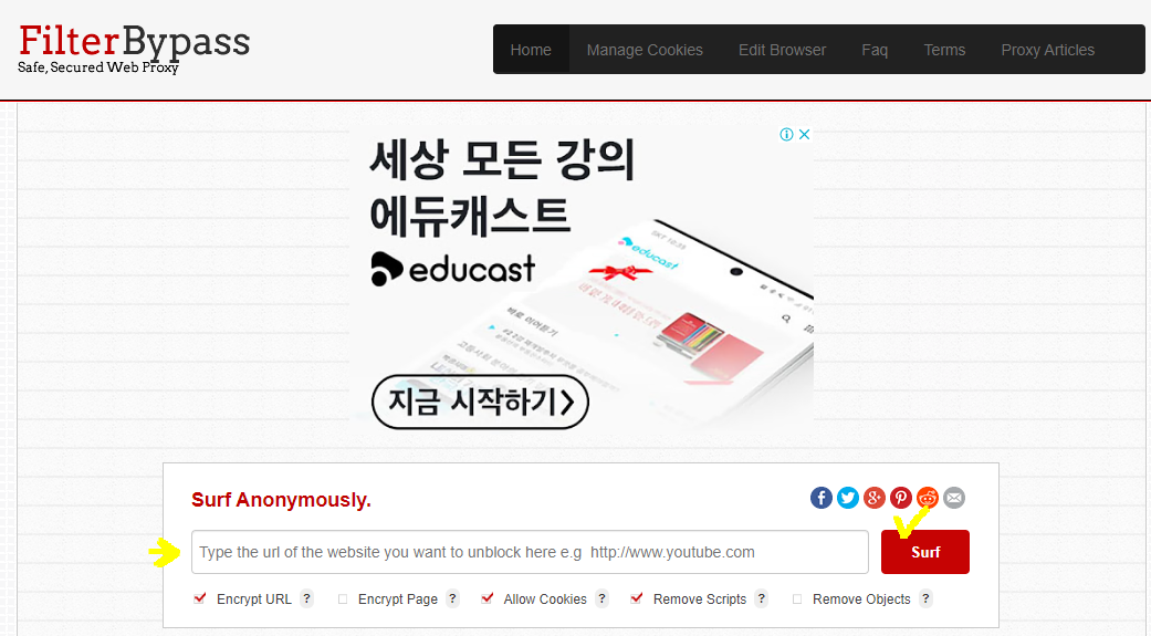 Proxy-bypass.com is a perfect place that you can use to bypass sites filtered by your workplace. It is designed to be simple, efficient and easy on the eyes. With our proxy you can now acess great social sites like facebook, twitter and pinterest. Our prox