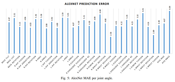 AlexNet은 8 개의 학습 가능한 계층으로 구성된 심층 신경망구조이다. 이 모델에는 약 5천 5백만 개의 훈련 가능한 매개 변수를 포함하고있다. 그림 5는 관절 당 MAE를 도식화하여 나타내었다. 제안 된 방법은 4.67 ± 2.08 도의 평균 MAE와 6.64 ± 2.73 도의 RMSE를 기록함으로써 매우 정확한 예측 결과를 나타내었다. 또한, 그림 6은 예측된 관절각도의 MAE의 분포를 나타낸다. 앞서 언급한 바와 같이 팔꿈치는 감지하기 가장 어려운 관절로 나타났다. 이는 제조업 조립 작업에서 작업자의 팔꿈치 위치가 급격하게 변하기 때문인 것으로 판단된다. 그러나 제안 된 방법은 손목, 어깨 및 등 관절을 감지하는 데 비교적 정확한 값을 나타내었다.