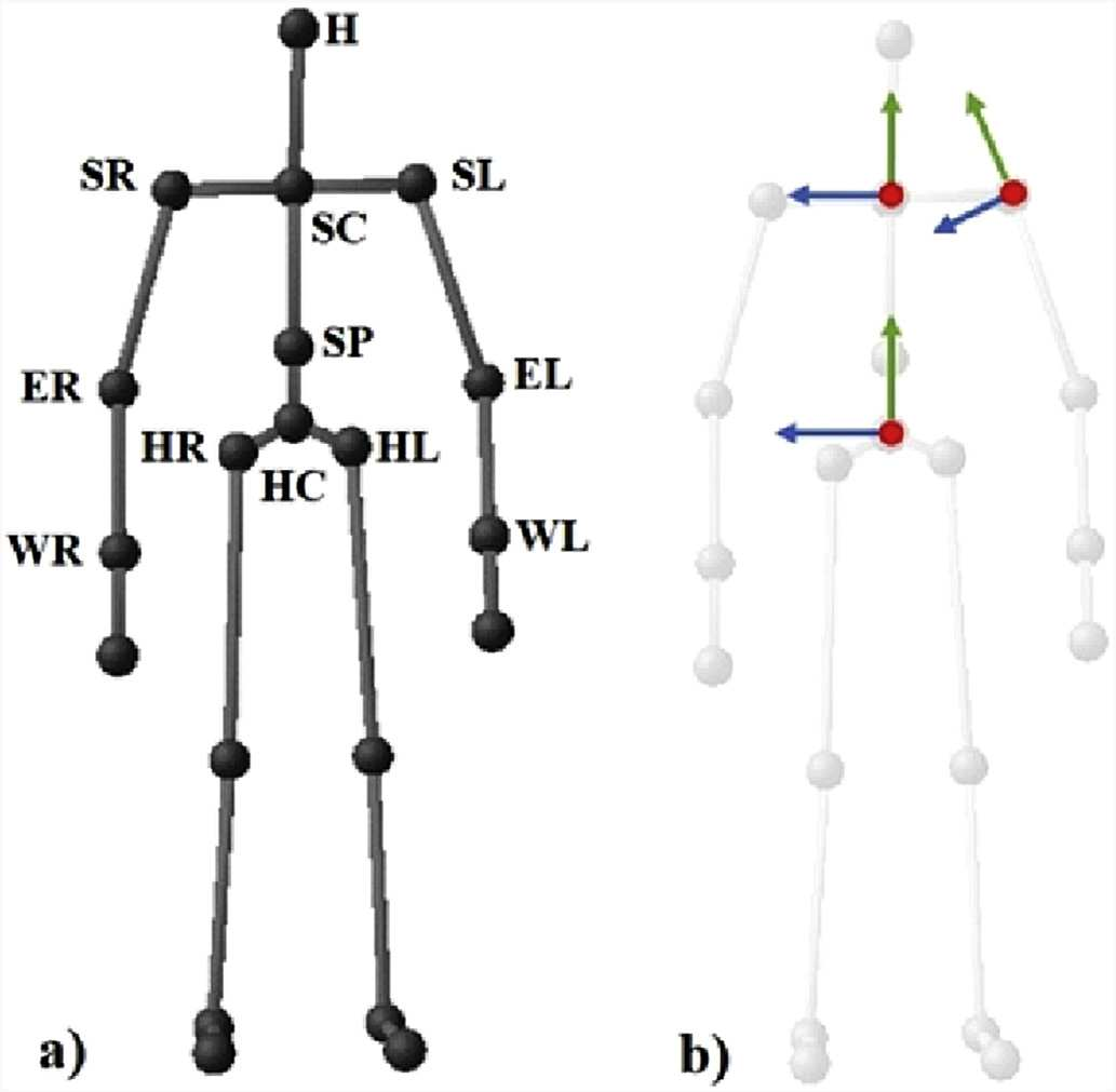 본 논문에서는 키넥트에서 도출된 좌표부위와 ISB Recommendation에서 제시하는 가이드라인과 완벽히 호환되지 않아 약간의 수정/호환을 위한 변경작업을 진행했다고 한다. 아래 그림의 (a)는 ISB Recommendation을 적용하기 위해 수정된 좌표계이고, (b)는 벡터값의 빨간축(점)이 X축, 파란축이 Z축, 초록축이 Y축을 의미한다.