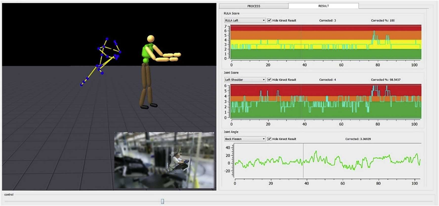 실제 현장에서 결과는 키넥트 RULA 점수와 인간공학 평가자 2명의 결과를 비교하여 정확도를 검증한다.