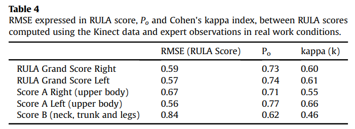 실험 2에서 실제 현장에서 촬영한 데이터로 분석한 결과는 키넥트로 도출한 각도값을 토대로 RULA 점수를 구하고, 인간공학 전문가 2명의 RULA평가결과와 비교하여 얼마나 일치한 결과가 도출되었는지 검증하였다. 검증기법으로 일치율(P0)와 Cohen's kappa 분석을 수행하였다. Cohen's kappa 분석은 두 평가자 간 일치율을 비교하는데 대표적으로 쓰이는 통계기법이다.