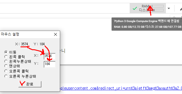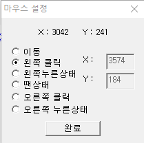 Step 3. 마우스 를 누르고 런타임 부분에 마우스를 가져다 대면 X, Y 좌표가 나온다. 그걸 빈칸에 입력해준다. 그리고 완료버튼 클릭.