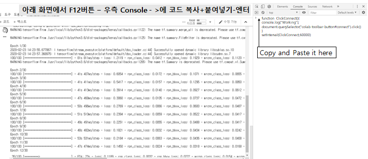 코랩 화면 + F12버튼 + 우측 상단 Console + > 표시창에 아래 코드 복사 붙여넣기