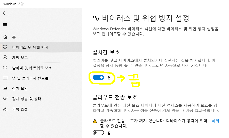 Step 1) 바이러스 및 위협 방지 - 실시간 보호 (끄기)
