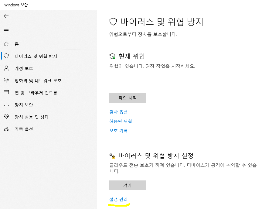 - 왼쪽 바이러스 및 위협 방지에서 설정 관리 클릭