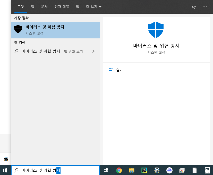 - 왼쪽 윈도우 표시 옆 "검색하려면 여기에 입력하십시오." 에 "바이러스 및 위협 방지" 를 입력한다.