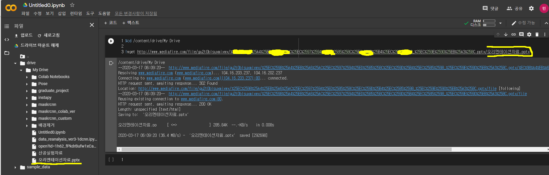 2) !wget 뒤에 MediaFire에서 링크를 복사한 것을 붙여넣는다.