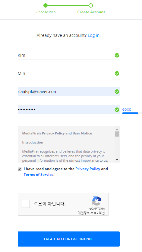 Step. 3 MediaFire 가입하기 (성/이름/메일/비번/맨밑 가입하기 클릭)