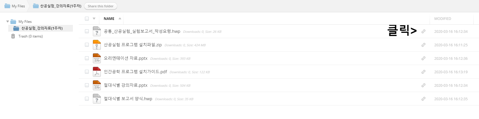 우측에 보면 8자같이 생긴 버튼이 링크를 만드는 버튼이다. 파일 하나하나 공유하고싶으면 파일 옆에있는 링크버튼을 눌러 공유하거나, 폴더전체를 공유하고싶으면 폴더 옆에 링크버튼을 클릭하자.