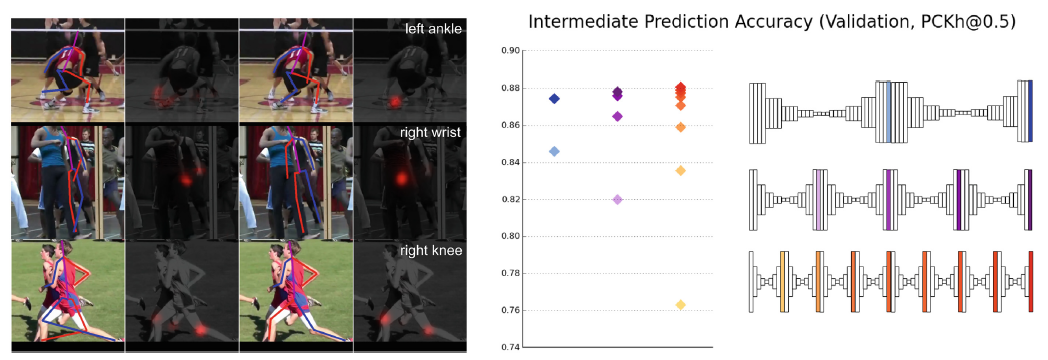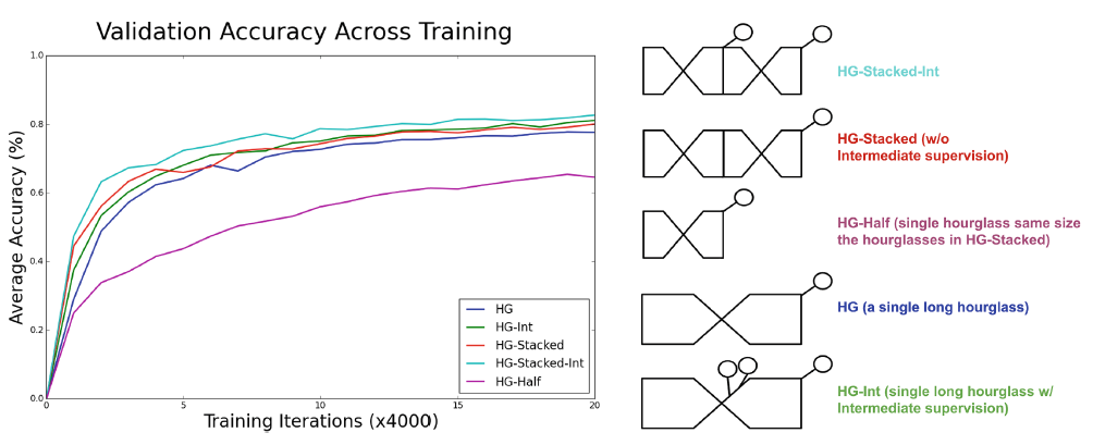 그림을 보면, 두 개의 Hourglass 네트워크 사이에 중간단계(Intermediate Supervision)이 존재한다.