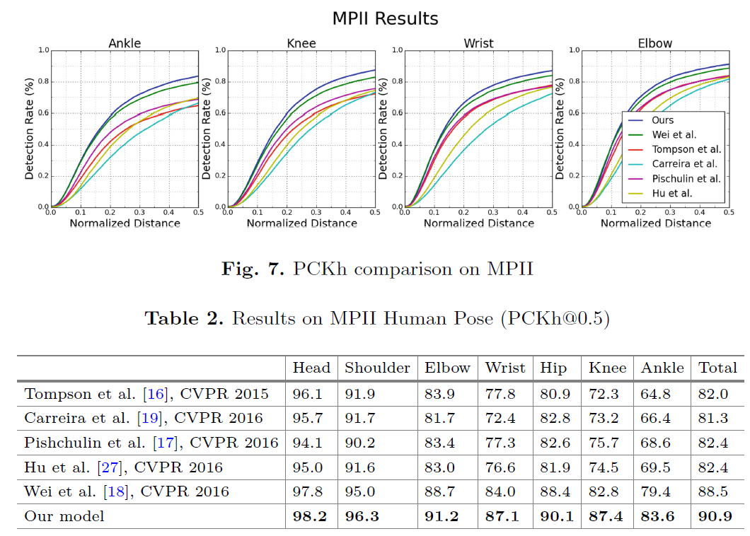 당시 SOTA급 논문들로 DeepCut, IEF, Tompson CVPR'15, CPM 등이 있는데, 가장 좋은 성능을 보였다.
