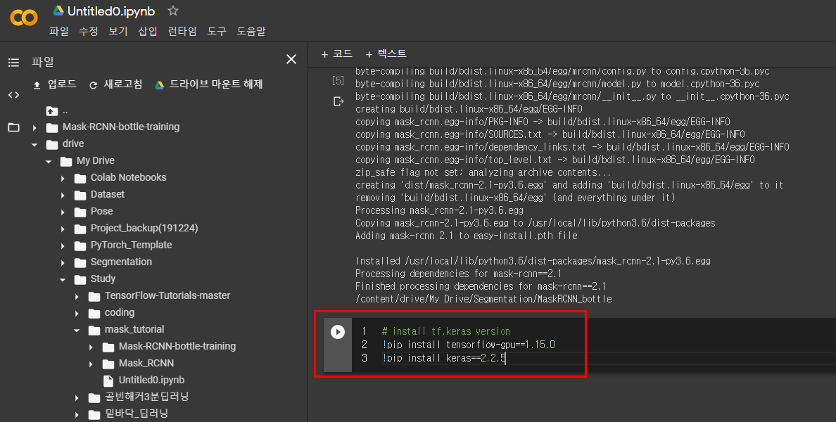 8. 다시 코드로 돌아와서 tensorflow-gpu = 1.15.0, keras=2.2.5 버젼으로 다운그레이드 해준다.(가장 중요!)