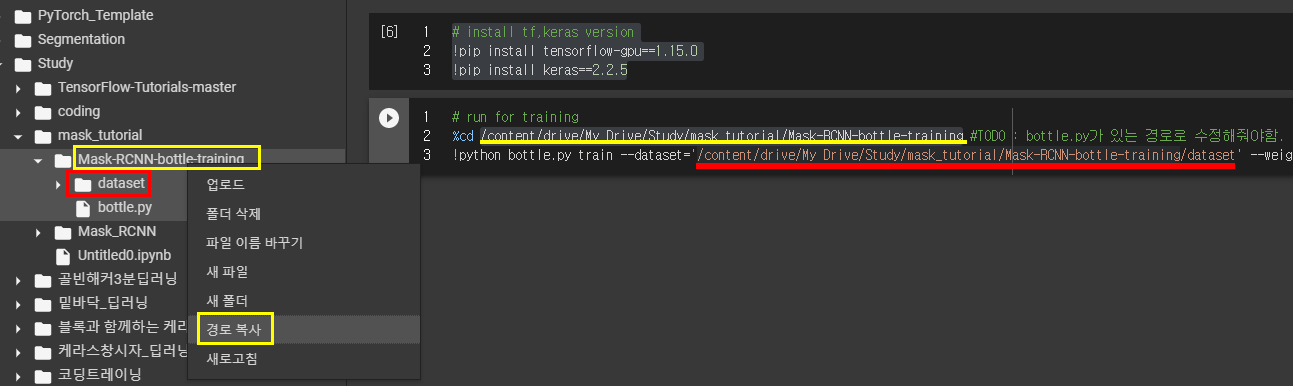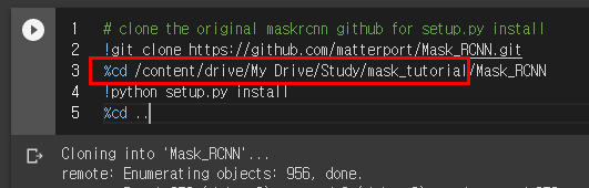 수정해야할 부분은 3번째 라인에 %cd /자기경로/Mask_RCNN/