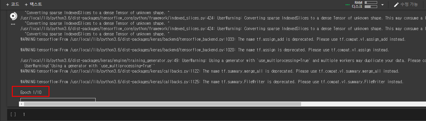 수많은 에러와 코드를 만지작거리며 스트레스받던 중 드디어 오늘 Epoch에 E가 보이기 시작했다.