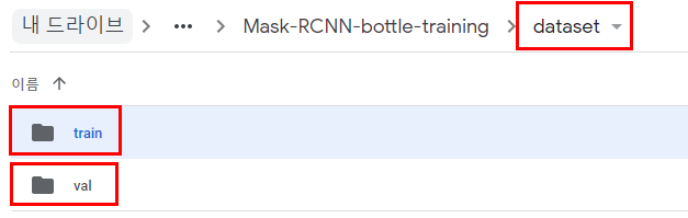 ▶ 구글드라이브로 가서 dataset 폴더에 train에 train용 사진과 라벨(via_region_data.json)을,