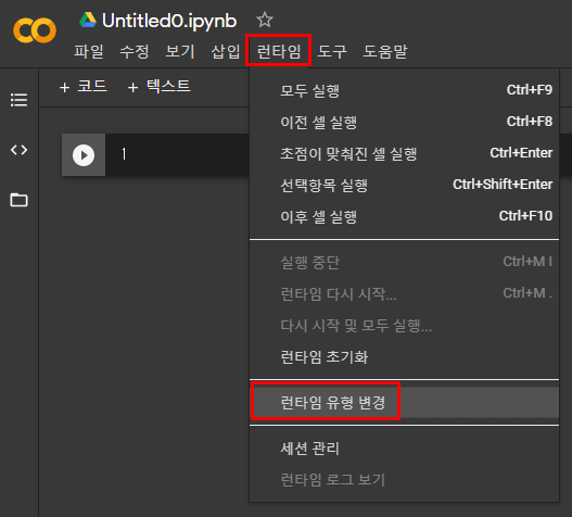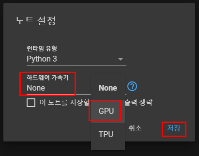 3. GPU 사용할것이기 때문에 런타임을 변경해서 GPU로 설정.