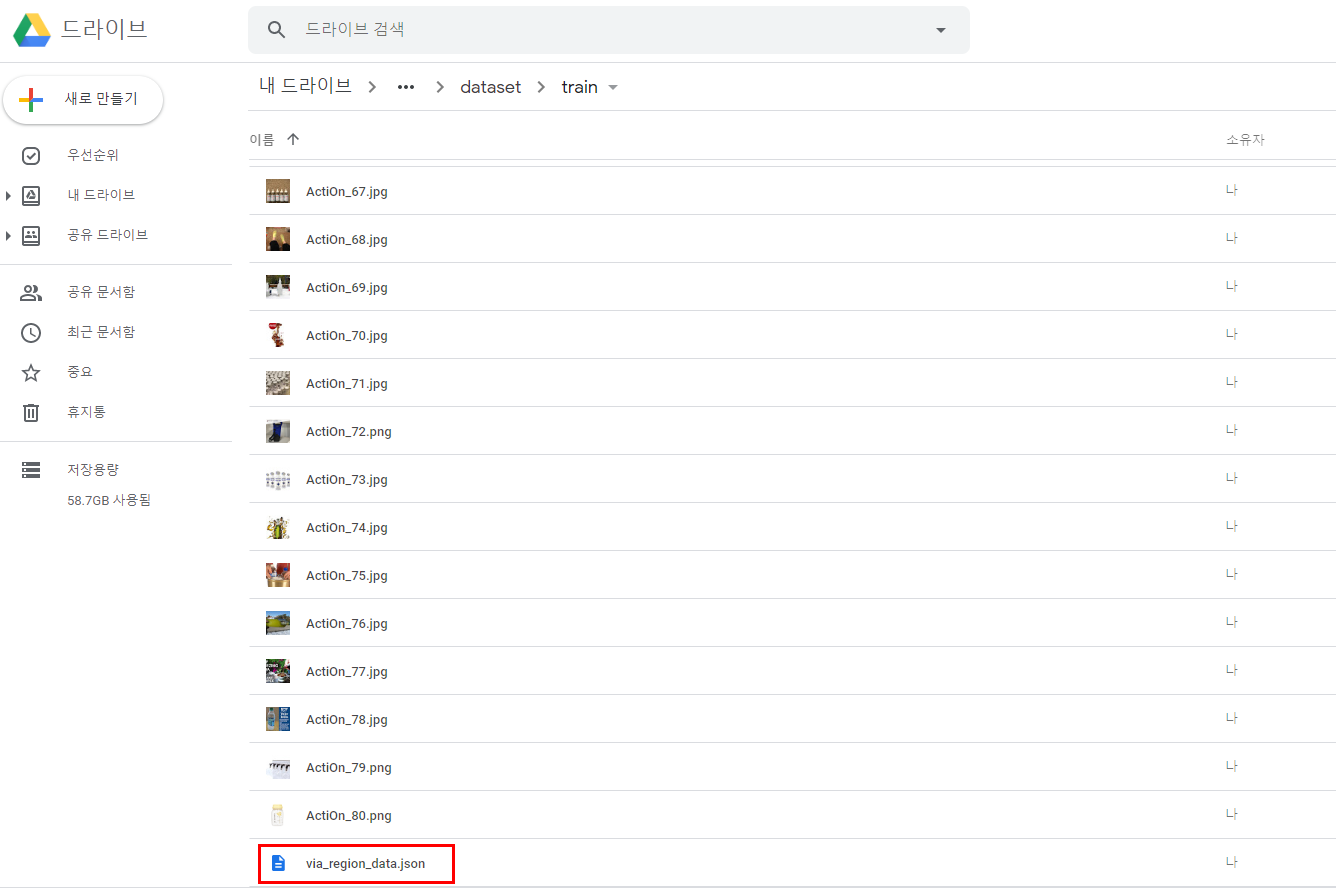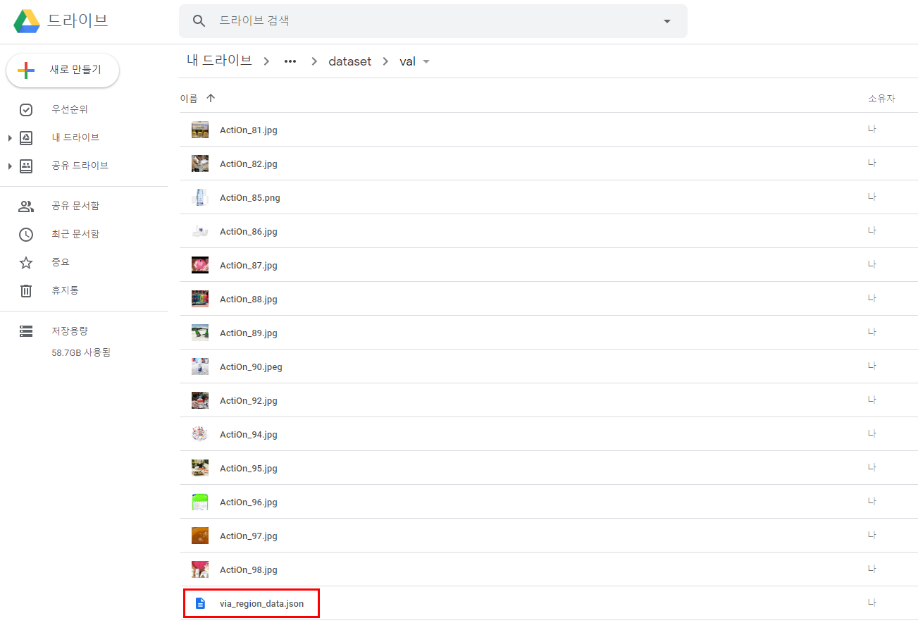 ▶ via_region_data.json 파일을 train 폴더(이미지있는곳)에 함께 저장해주고, validation 용 이미지들도 동일하게 라벨링 하고 via_region_data.json 파일을 val폴더에 넣어준뒤 구글드라이브로 업로드시킨다.