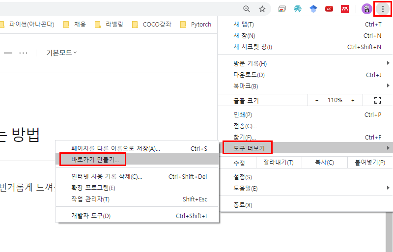 2. 구글 크롬(우측상단) - 도구 더보기 - 바로가기 만들기