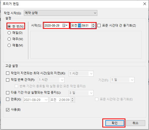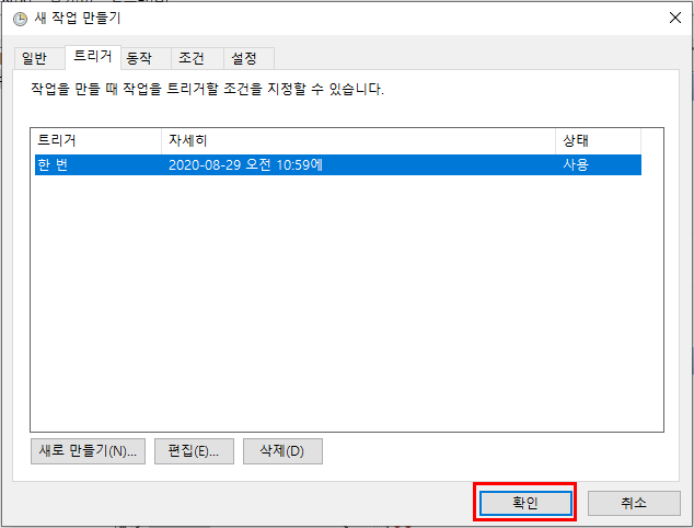 4. 트리거탭 - 새로만들기 - 한번 or 매주 - 날짜/시간(초) 입력 - 확인 - 또 확인 클릭.