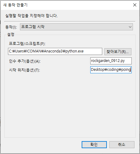 3.3 시작 위치(옵션) : 파이썬파일(rockgarden0912.py)가 있는 폴더 경로