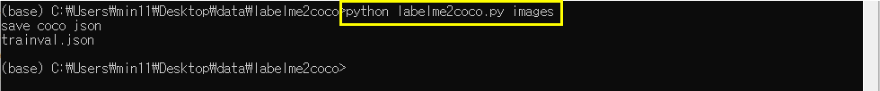 labelme2coco 폴더이동 - labelme2coco.py실행(>>>python labelme2coco.py images) - trainval.json생성됨