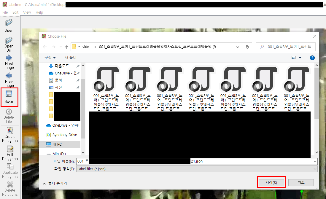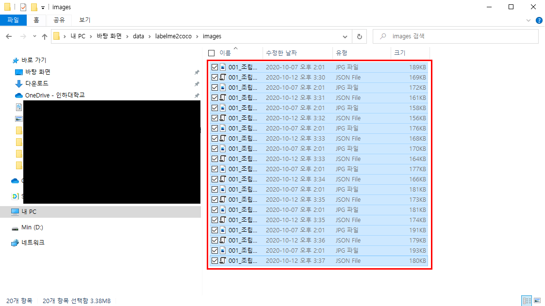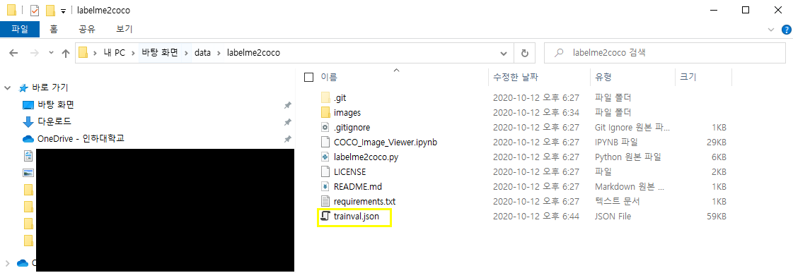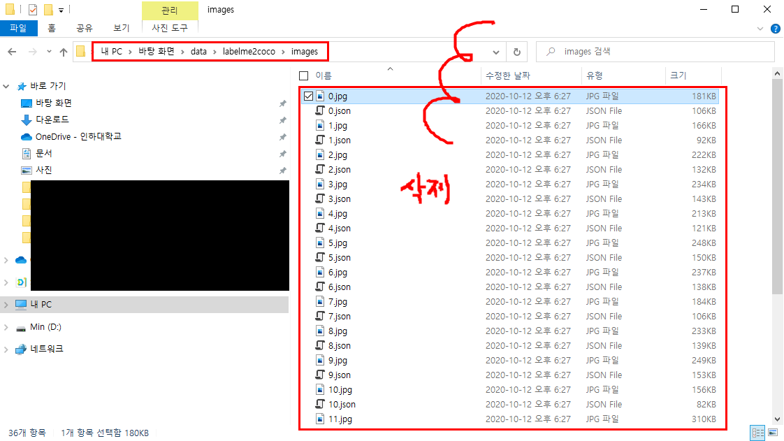 lableme2coco-images 폴더에 들어가서 기존에 있는 예제 이미지/라벨 삭제 후 내꺼 이미지/라벨 붙여넣기