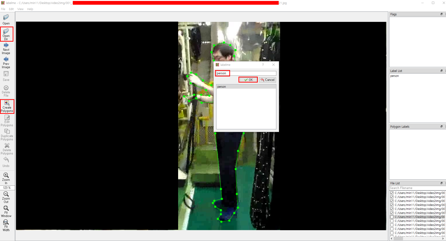 Create Polygons 클릭 - 사람 테두리 클릭-클릭-클릭-클릭 ... (잘못 클릭했다면 ctrl+z로 이전)