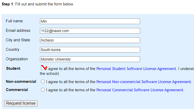 파란색부분 정보입력 - Student에 체크 - Request License클릭