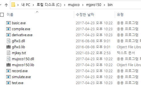 C드라이브에 mujoco 라는 폴더를 새로 만들고 압축을 풀고 난 mjpro150폴더를 위치시킨다.