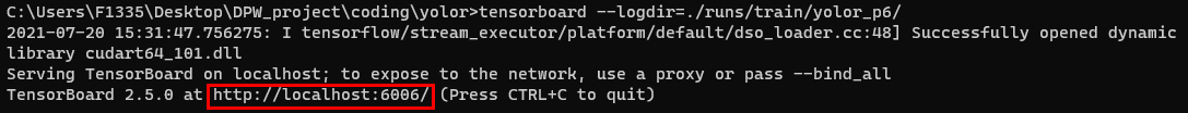 학습 완료 후 결과를 보고싶다면, cmd창에서 아래 코드 돌리고, ctrl+아래 빨간박스부분 클릭하면 웹페이지가 열리면서 텐서보드결과가 나온다.
