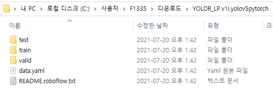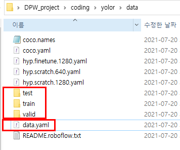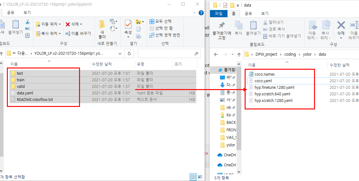 roboflow에서 받은 데이터셋을 yolor 리포에 data 폴더로 붙어넣기