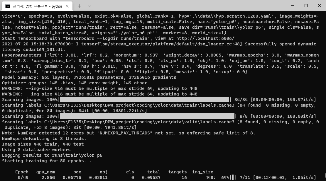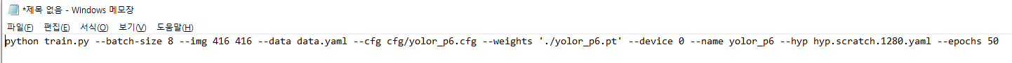 python train.py --batch-size 8 --img 416 416 --data data.yaml --cfg cfg/yolor_p6.cfg --weights './yolor_p6.pt' --device 0 --name yolor_p6 --hyp hyp.scratch.1280.yaml --epochs 50