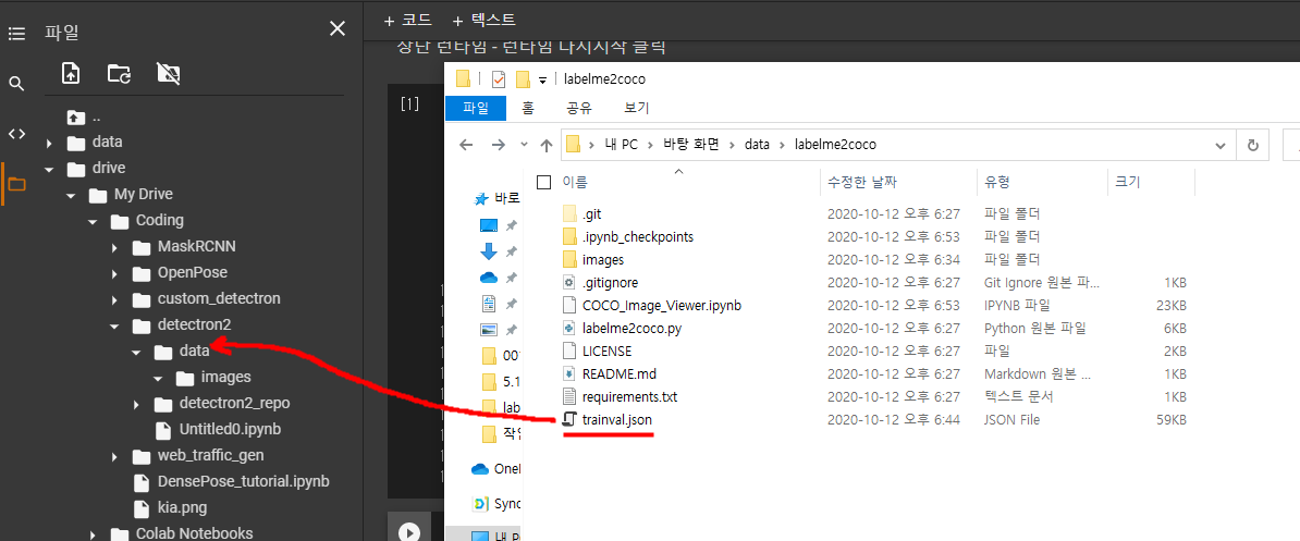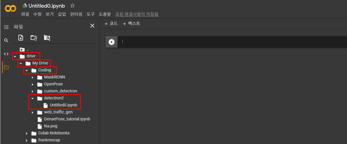 폴더를 하나씩 눌러보면 drive/My Drive/Coding/detectron2 폴더가 보인다.