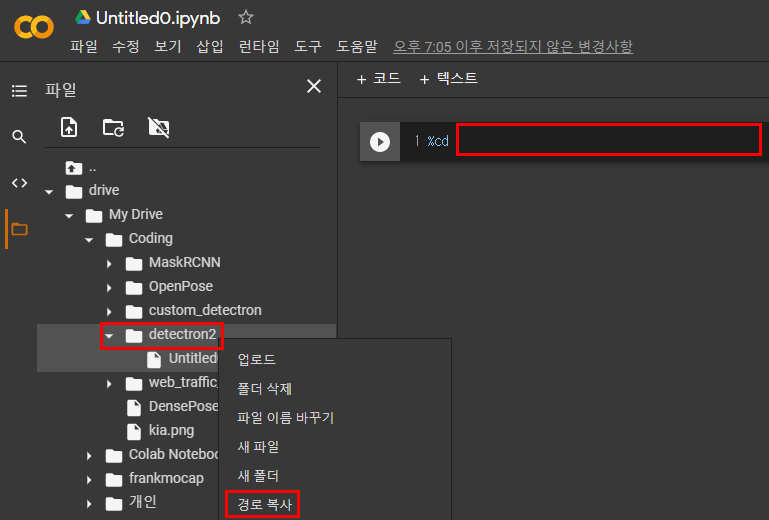 폴더 우클릭 - 경로복사 - 코드 첫 줄에 %cd /content/drive/My Drive/Coding/detectron2 입력